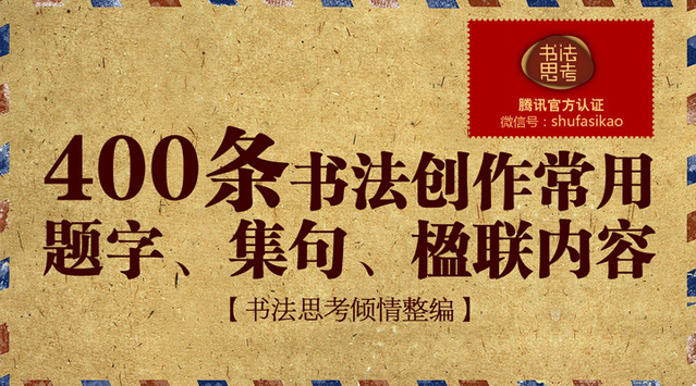 不知您在书法创作或给朋友题字时,有没有“书”到用时方恨少的感觉?如果有,其实也正常,再饱满的学士也难免有“墨穷”的时候。特此,【书法思考】为大家整理了400条最全、最实用、最具养分的书法常用词语、集句和楹联内容大全,含繁体对照!墨客必备,值得右键分享、收藏。